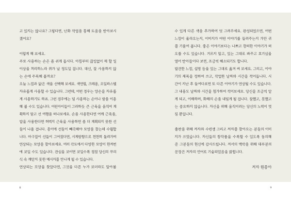 이 책은 단순한 미술치료 안내서를 넘어, 삶을 성찰하고 내면과 화해하는 치유의 기록입니다. 그림을 잘 그리지 않아도, 특별한 도구가 없어도, 누구나 낙서 한 줄에서 시작할 수 있습니다. 무질서한 선에서 의미를 발견하는 과정은 혼란 속에서 자신만의 이야기를 건져 올리는 과정이기도 합니다.