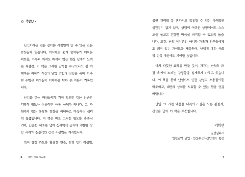 특히 감정 카드를 활용한 연습, 감정 일기 작성법, 불안 관리법 등 혼자서도 적용할 수 있는 구체적인 실천법이 담겨 있어, 상담이 어려운 상황에서도 스스로를 돌보고 건강한 마음을 유지할 수 있도록 돕습니다. 또한, 난임 여성뿐만 아니라 가족과 친구들에게도 의미 있는 가이드를 제공하며, 난임에 대한 사회적 인식 개선에도 기여할 것입니다.