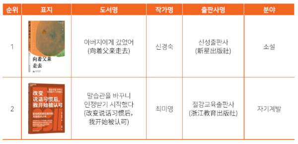 지난 5월 말 출간된 한강 작가의 《노랑무늬영원》(伤口愈合中)은 신간 베스트셀러 93위에 오르며 100위내 유일한 한국 도서로 자리매김했다. 캐나다, 미국, 프랑스, 일본 등 국적 작가가 3~5명인 것에 비해서는 다소 아쉬운 부분이다. 하지만 6월 해외 소설 신간 베스트셀러에서는 1위를 차지하며, 브라질 작가 주앙 기마랑이스 호사(João Guimarães Rosa), 헤르만 헤세, 부커상 후보 인도네시아 작가 노르만 에릭슨 빠사리부(Norman Erikson Pasaribu)를 모두 제쳤다. 6월에는 해외 신간 소설 100위 내 총 5권의 한국 소설이 포함 되는 성과를 거두었다. 《노랑무늬영원》 외에도, 신경숙의 《아버지에게 갔었어》 43위, 박범신의 《깨소금과옥떨메》 45위, 이금이의 《소희의 방》 57위, 《숨은 길 찾기》 66위로 특히 신경숙 작가의 도서를 제외하고는 출간된 지 1~2달 정도 지났지만, 그 인기를 이어가고 있다는 점에서 주목할 만하다. 한국 문학 장르가 중국에서 지속적으로 환영받고 있긴 하지만, 반짝 순위권에 올라도 순위가 상승하거나 유지되는 모습은 찾아보기 힘들었는데, 도서와 관련된 굿즈 증정 등 관련 이벤트 등으로 화제성을 유지하고 있다.