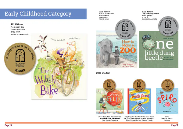 유아와 저학년 독자를 위한 얼리 차일드후드(Early Childhood) 부문에서는 대런 매컬럼(Darren McCallum)과 크레이그 스미스(Craig Smith)의 《흔들흔들 자전거》(The Wobbly Bike)가 수상작으로 선정되었다. 이 부문에는 전년 대비 21% 증가한 153편이 출품되었는데, 라임과 리듬이 살아 있는 텍스트, 유머러스한 설정, 가족과 자연을 다룬 작품이 다수였다. 특히 다양한 가족 형태와 다문화적 배경이 사실적으로 표현되었으며, 원주민 작가와 일러스트레이터의 참여도 증가했다. 약 30%의 작품이 동물과 자연을 소재로 삼았다는 점도 눈에 띈다. 유아 문학의 특성상 낭독성과 리듬감이 중시되었으며, 이는 성인과 아동이 함께 읽는 경험을 통해 책의 즐거움을 확장하는 역할을 했다.