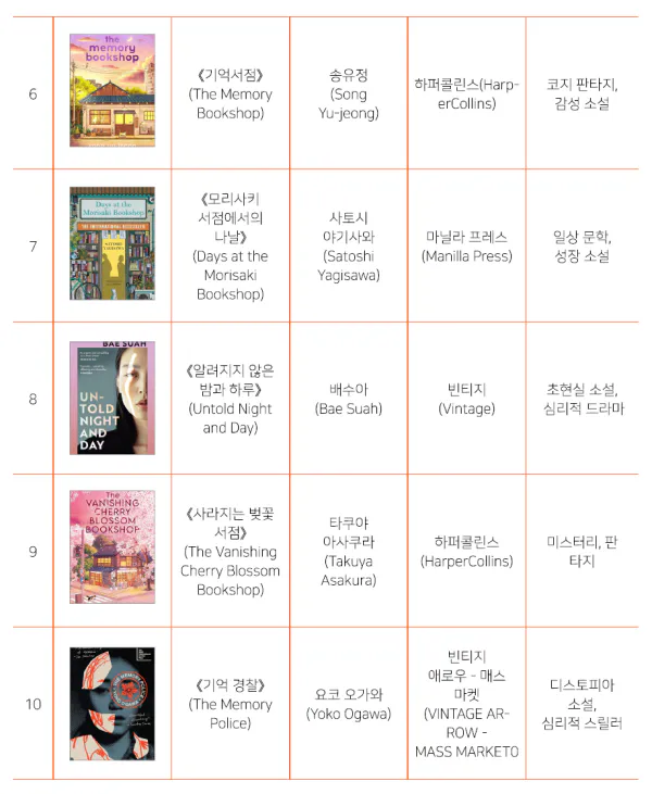 호주 번역 도서 시장에서는 일본 문학 작품 역시 상위권에서 강세를 보이고 있으며, 《작은 도쿄 꽃가게》(The Little Tokyo Flower Shop), 《여행하는 고양이 연대기》(The Travelling Cat Chronicles), 《모리사키 서점에서의 나날》(Days at the Morisaki Bookshop), 《사라지는 벚꽃 서점》(The Vanishing Cherry Blossom Bookshop), 《기억 경찰》(The Memory Police) 등이 독자들의 감성적 선호와 문화적 흥미를 충족시키며 안정적인 판매와 긍정적 평가를 기록하고 있다. 전반적으로 상위권 번역 도서는 감성과 문화적 공감을 중심으로 호주 독자에게 수용되고 있다.