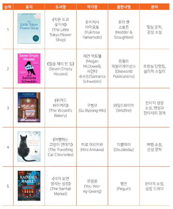 최근 호주 출판시장에서 번역 도서의 관심이 꾸준히 증가하고 있는 것으로 보인다. 특히 일본과 한국 문학 작품들이 현지 독자들의 주목을 받고 있으며, 감성적이고 서정적인 이야기를 중심으로 호주 독자들에게 새로운 문화적 경험을 제공하고 있다. 한국 도서의 경우 《위저드 베이커리》(The Wizard’s Bakery), 《비가 오면 열리는 상점》(The Rainfall Market), 《기억서점》(The Memory Bookshop), 《알려지지 않은 밤과 하루》(Untold Night and Day) 등이 현지 독자 사이에서 높은 관심을 받고 있다. 이들 작품은 현대 사회의 고독과 인간관계의 복잡성을 주제로 다루며, 문화적 배경이 다름에도 불구하고 보편적인 정서와 공감을 불러일으킨다는 점에서 호주 독자들에게 안정적으로 수용되고 있는 것으로 보인다. 또한 한국 드라마와 영화 등 대중문화와의 연계로 한국 문학에 관한 관심이 높아진 점도 인기 요인으로 작용하고 있다.