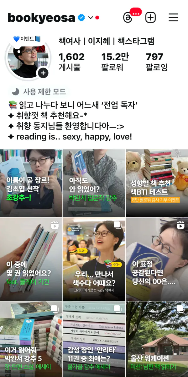 책을 추천한 후 가장 반가운 반응은 ‘공감’이다. 개인적인 취향이 하나의 책에서 만나는 순간은 물론 그 순간을 나누는 댓글이나 DM(Direct Message)은 거친 온라인 댓글 문화 속에서도 따뜻함을 잃지 않는다. “저도 좋아하는 책이에요.”, “책여사 님 덕분에 다시 책을 읽게 되었어요.”라는 메시지를 받을때면, 오히려 내가 더 큰 선물을 받는 듯하다. 특히 육아, 직장, 학업 등으로 책을 멀리했던 사람들이 나의 추천으로 다시 찾은 독서의 기쁨을 전할 때면 지난 나의 경험이 떠오르며 큰 울림을 받는다. 어떤 이는 나의 책 리뷰 콘텐츠를 보고 그 책을 읽기 위해 도서관 회원증을 다시 만들었고, 또 다른 이는 부모님께 책을 선물했다고 했다. 책 한 권이 개인의 습관과 관계의 방식을 바꾸는 것을 확인할 때마다 도서 추천이 결코 가벼운 행위가 아님을 절실히 느낀다.